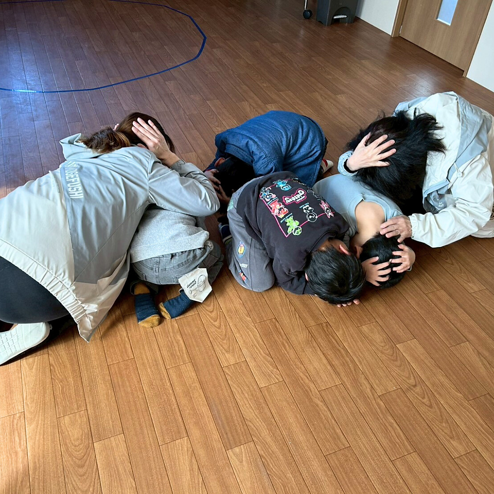 職員が地震アラームを流すと、児童発達支援では子どもたちとうきわくの職員が部屋の中央に集まり、身を低くして頭を守る姿勢をとります